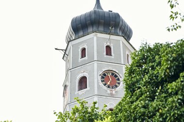 Die Turmbesteigung ist nach dem Schloss Gayenhofen die zweite Station der heutigen Nachtwächterführung – und der Höhepunkt des abendlichen Rundgangs. Unser Nachtwächter Markus hat bereits viele spannende Details über die Geschichte der mittelalterlichen Stadt Bludenz und ihre Entwicklung bis in die heutige Zeit erzählt. Jetzt, fast oben angekommen, können wir schon die drei Glocken der St. Laurentiuskirche erahnen. Markus erklärt uns, dass die Bludenzer 160 Jahre sparen mussten, um sich den Wiederaufbau des Kirchturms nach einem verheerenden Brand leisten zu können.