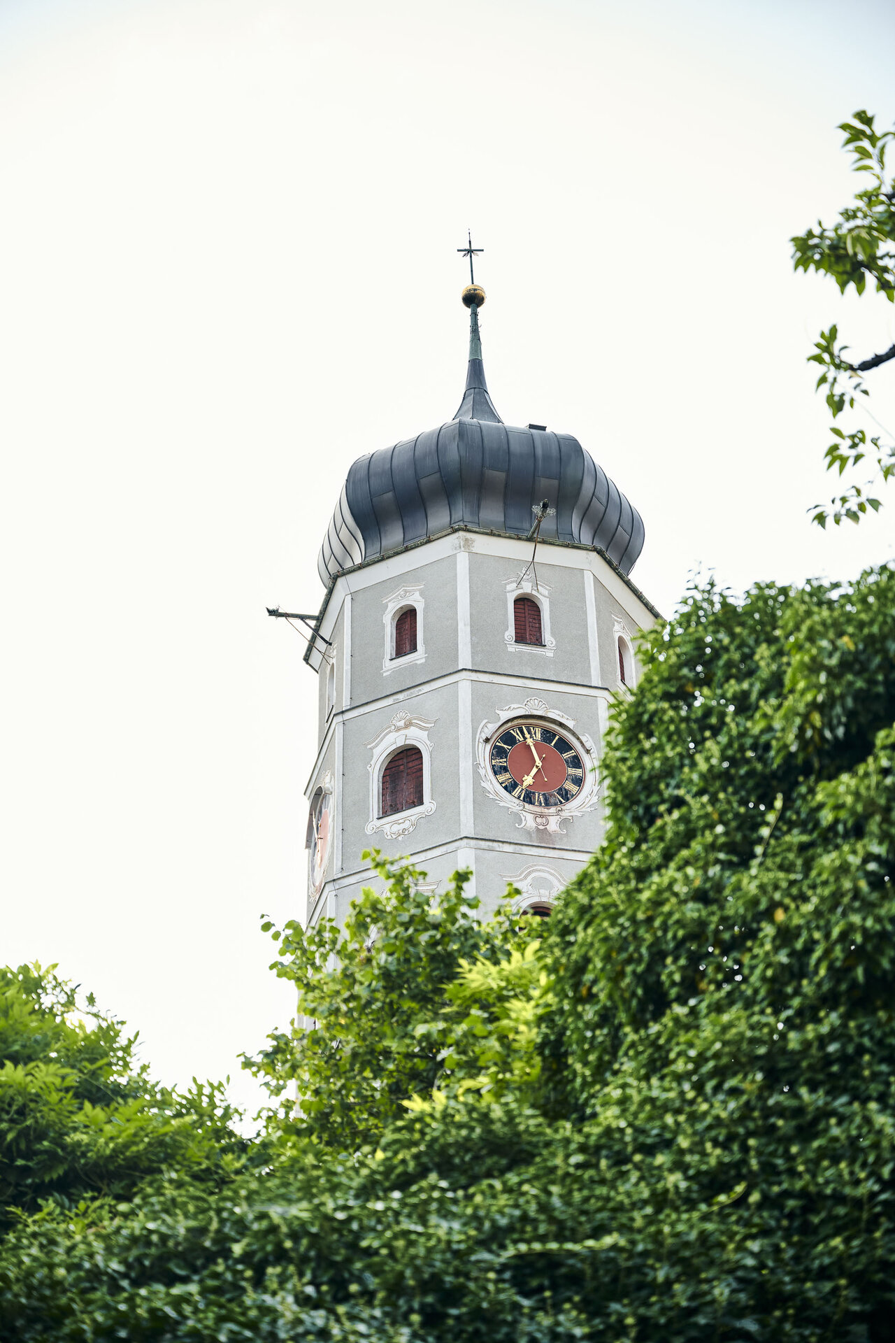 Leicht außer Atem erreichen wir schließlich die kleine Plattform unterhalb des Zwiebelturms. Markus öffnet die Läden der acht Fenster – und der Anblick raubt uns ein weiteres Mal den Atem. In der Abenddämmerung erstrahlen die Lichter der Stadt, während unser Blick über die umliegenden Berge und Täler schweift: das Brandnertal, das Klostertal und der Walgau. Einfach wunderschön.