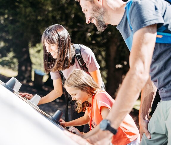 „Pssst, da vorn raschelt etwas!“ Wir lauschen. Ein Eichhörnchen huscht durch das Geäst. Es scheint uns kurz zu mustern, verschwindet dann mit einem Sprung im Dickicht. Genau darum geht es auf dem Tierwelten-Weg – zu verstehen, wie die AlpentTiere leben. An den Erlebnisstationen schlüpfen wir selbst in ihre Rollen: Tanzen wie eine Biene, pfeifen wie ein Murmeltier, schnuppern wie ein Fuchs. Wer schafft es, die Eule lautlos nachzuahmen? Dieser Themenweg macht Natur erlebbar und zeigt uns, wie viel wir von der Tierwelt lernen können.