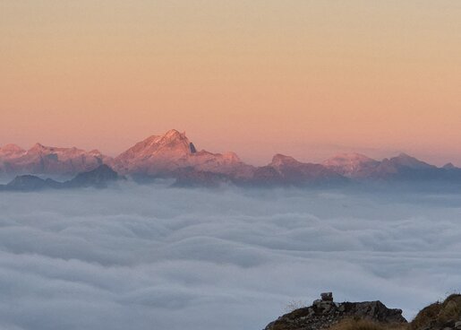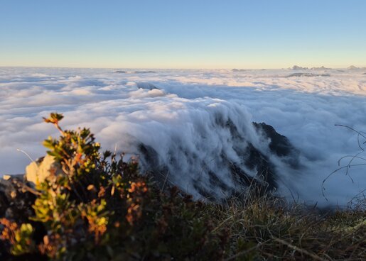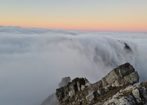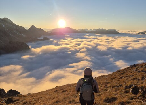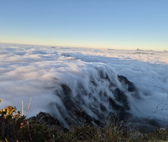 Mit jedem Höhenmeter wird die Sicht besser. Die ersten Sonnenstrahlen brechen durch, die Luft wird trockener. Und dann – oft plötzlich – liegt das Tal wie ein wogendes, stilles Meer unter den Füßen. Ein Moment, der nicht laut ist, sondern still und klar.