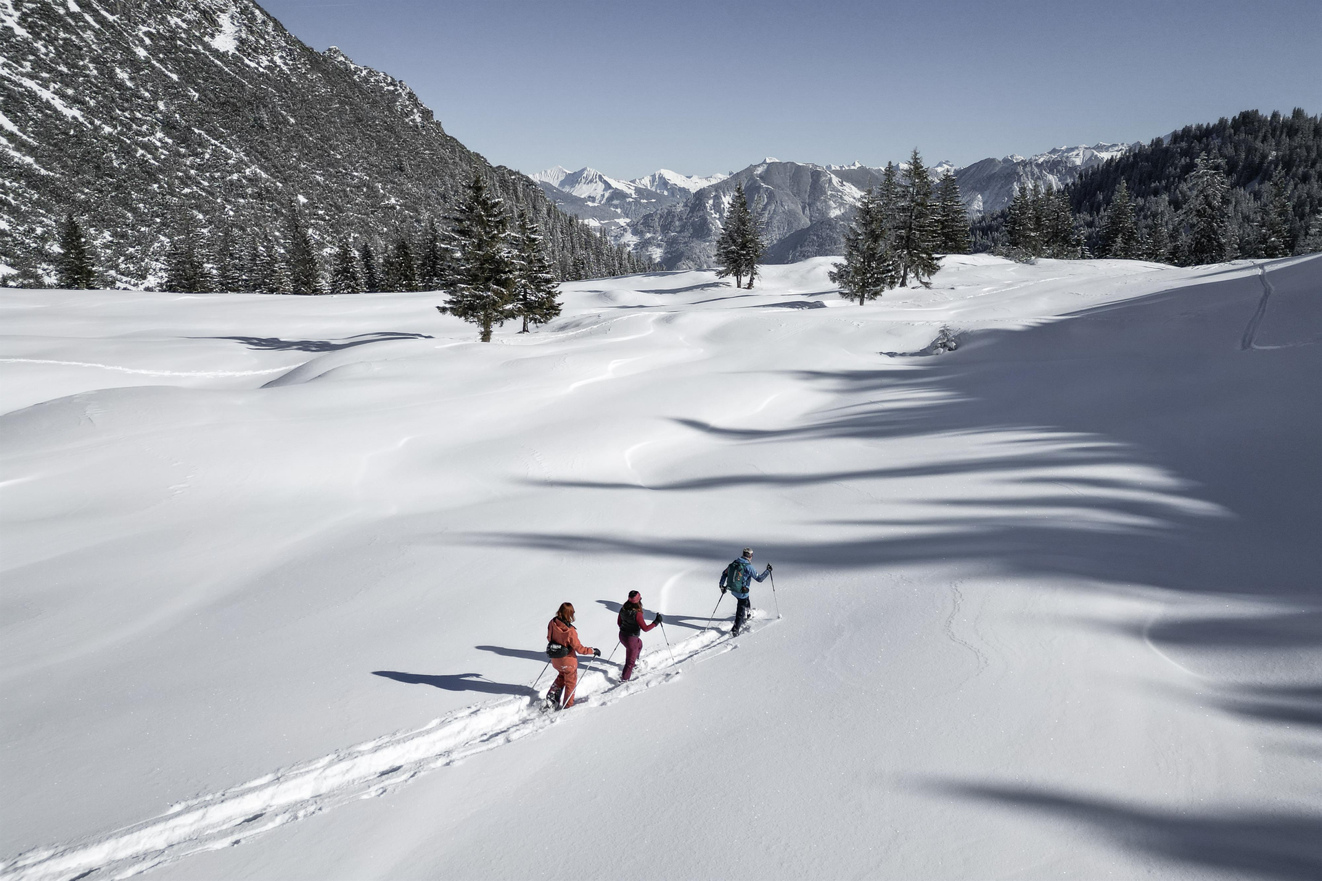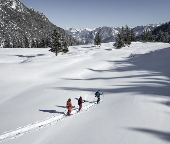 This tour is for snowshoe hikers in good physical condition. We take the Palüdbahn cable car up to an altitude of 1600 metres, from where we hike up to the Amatschonjoch at 2028 metres in an overwhelming mountain landscape. After a break we descend in a wide arc to the Palüd ski resort. If there is an avalanche warning of level 3 or higher, the tour will take you to the lower Brüggele.