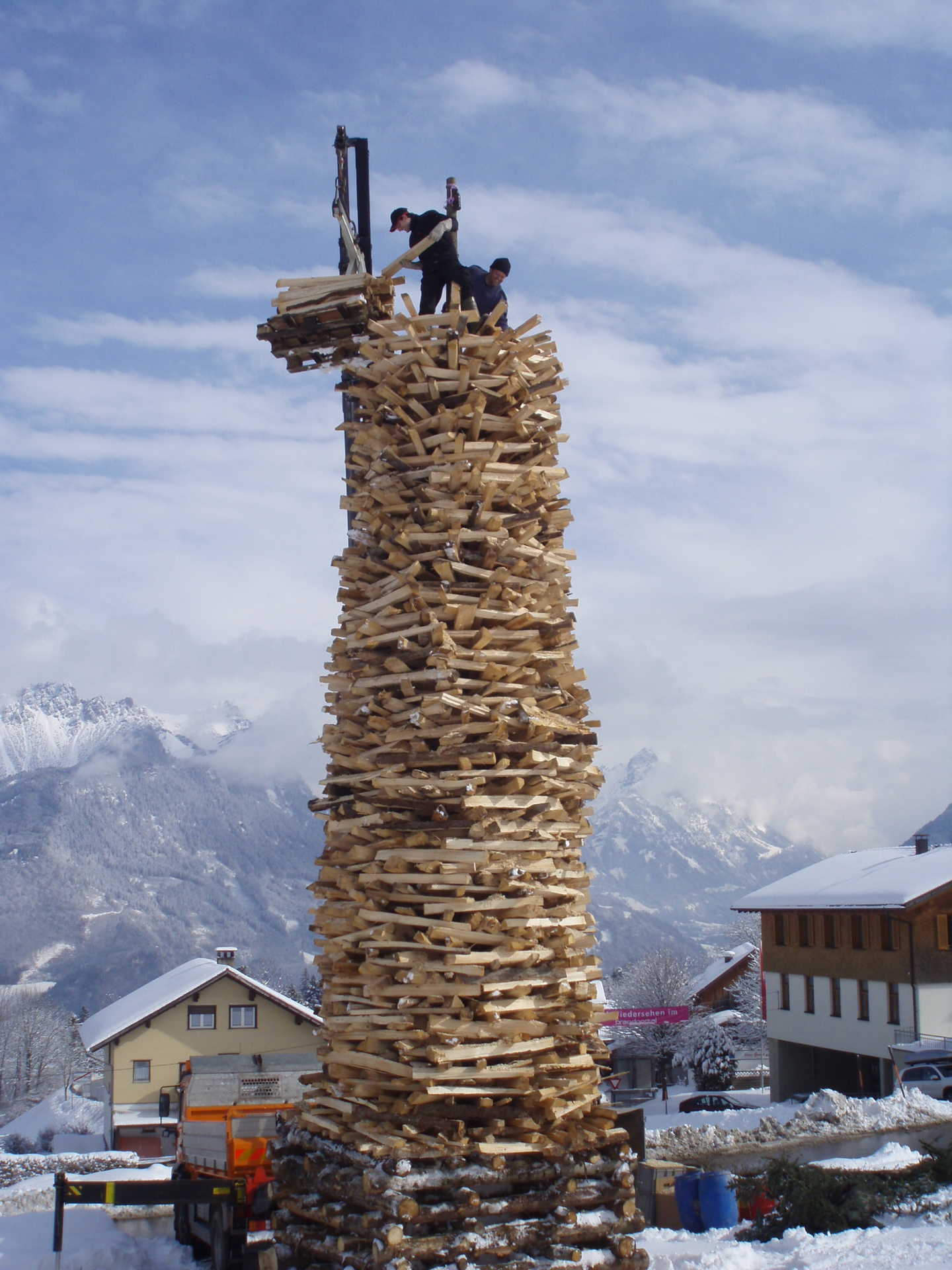 In Bürserberg and Brand, the sparking tower is not built with pallets and Christmas trees as in other communities. The special construction method of the spark has been a tradition for many years. Logs are stacked high without using a single nail or other fastener.