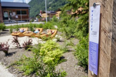 Aber auch nach einer ausgedehnten Wanderung im Klostertal lassen sich auf diese Weise müde Muskeln wieder aktivieren. Der Kneipp und Relax Garten Alfenz in Klösterle ist eine Oase der Entspannung und Erholung inmitten einer Vielzahl blühender Kräuter, Büsche und Blumen – insgesamt sind es über 2.000 Pflanzen. „Wir haben Wert darauf gelegt, Insekten Nahrung und Lebensraum zu bieten und den Garten so naturnah wie möglich zu gestalten“, berichtet Cornelia. Und so schaukeln und brummen eine Vielzahl von Schmetterlingen, Bienen und Hummeln von Blüte zu Blüte. Wer die Atmosphäre noch etwas länger genießen möchte, der kann sich auf eine der Ruheliegen zurückziehen. Vielleicht möchte man dabei in einem Buch schmökern, vielleicht möchte man aber auch einfach den einmaligen Ausblick auf die Bergwelt des Klostertals genießen und die Seele baumeln lassen. Wer noch tiefer ins Element Wasser eintauchen möchte, der braucht nur durch den Garten zu wandern und die Straßenseite zu wechseln. Dort befindet sich nämlich der Almwasserpark Klösterle, ein kleines Badeparadies mit Natursee, Kinderbecken und Beachvolleyballfeld.