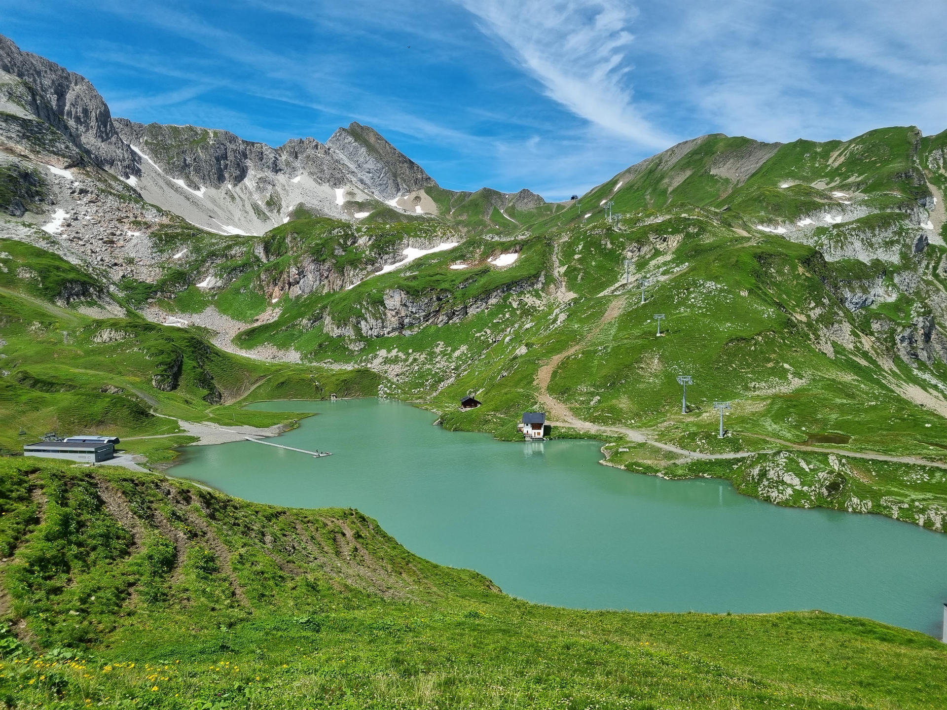 The Seekopfbahn cable car provides easy access to the hiking region around the Zürsersee, with its inviting wooden jetty in the water.