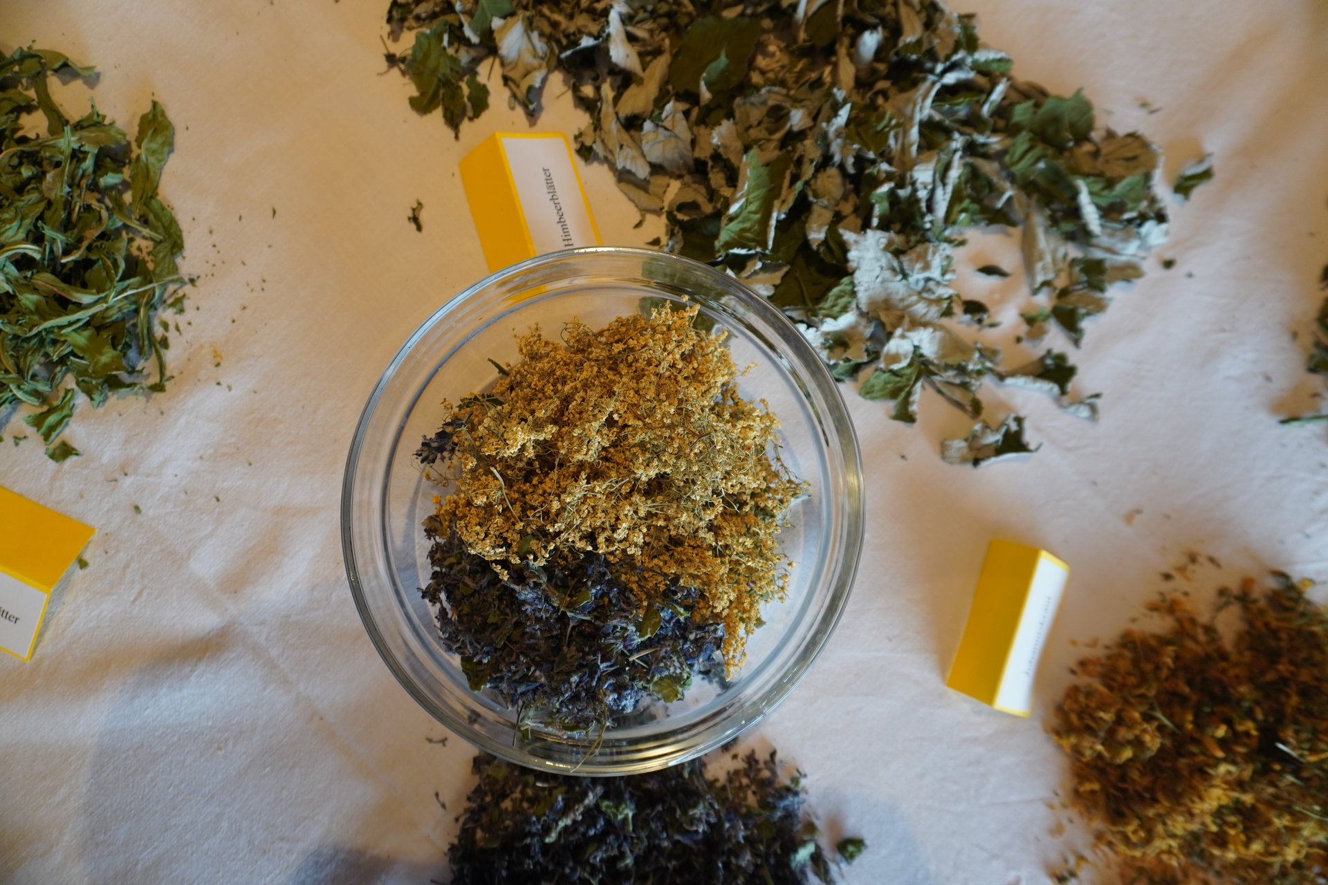 Die Regel, genau sieben Kräuter zu mischen, wurde uns ebenfalls nahegebracht. Diese Zahl, mystisch und symbolträchtig, verspricht eine ausgewogene Mischung, ohne dass ein Kraut dominiert. Mein persönliches Highlight ist das Mischen unserer eigenen Tees. Jede Person erhält eine Schüssel und ein Etikett, um die Zutaten der Mischung festzuhalten. Anfangs zögerlich, wähle ich bald mutig meine sieben Kräuter. Einige kenne ich bereits, andere wähle ich nach Farbe und Intuition.