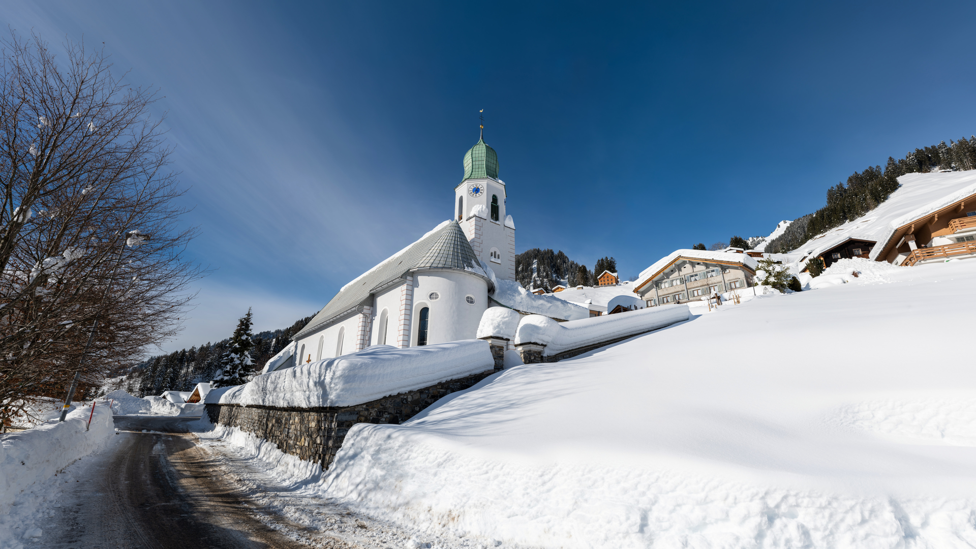 Winterwandern entlang der geräumten Gemeindestraße in die Ortsteile Mittelberg und Türtsch in Fontanella.