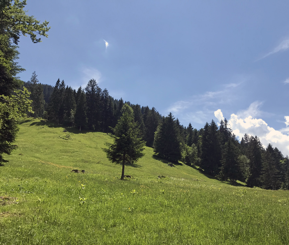 Am Ende des Wieswegs geht es auf dem Güterweg Ludescherberg leicht ansteigend bis zur Weggabelung. Dort den oberen Weg nehmen, welcher zur Parzelle Grüneck führt. Eine herrliche Aussicht über den Walgau bis hin zu den Schweizer Bergen erwartet Dich. Am Haus Nr. 80 gelangst Du auf den Labomweg, welcher wiederum an zahlreichen Heubargen, Mager- und Streuwiesen vorbei führt.
